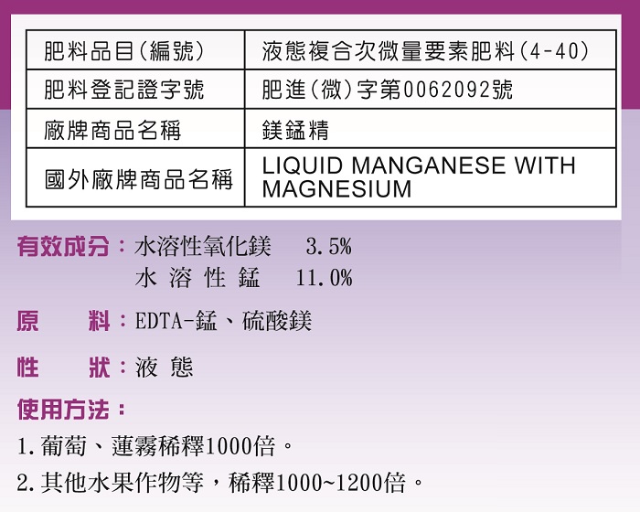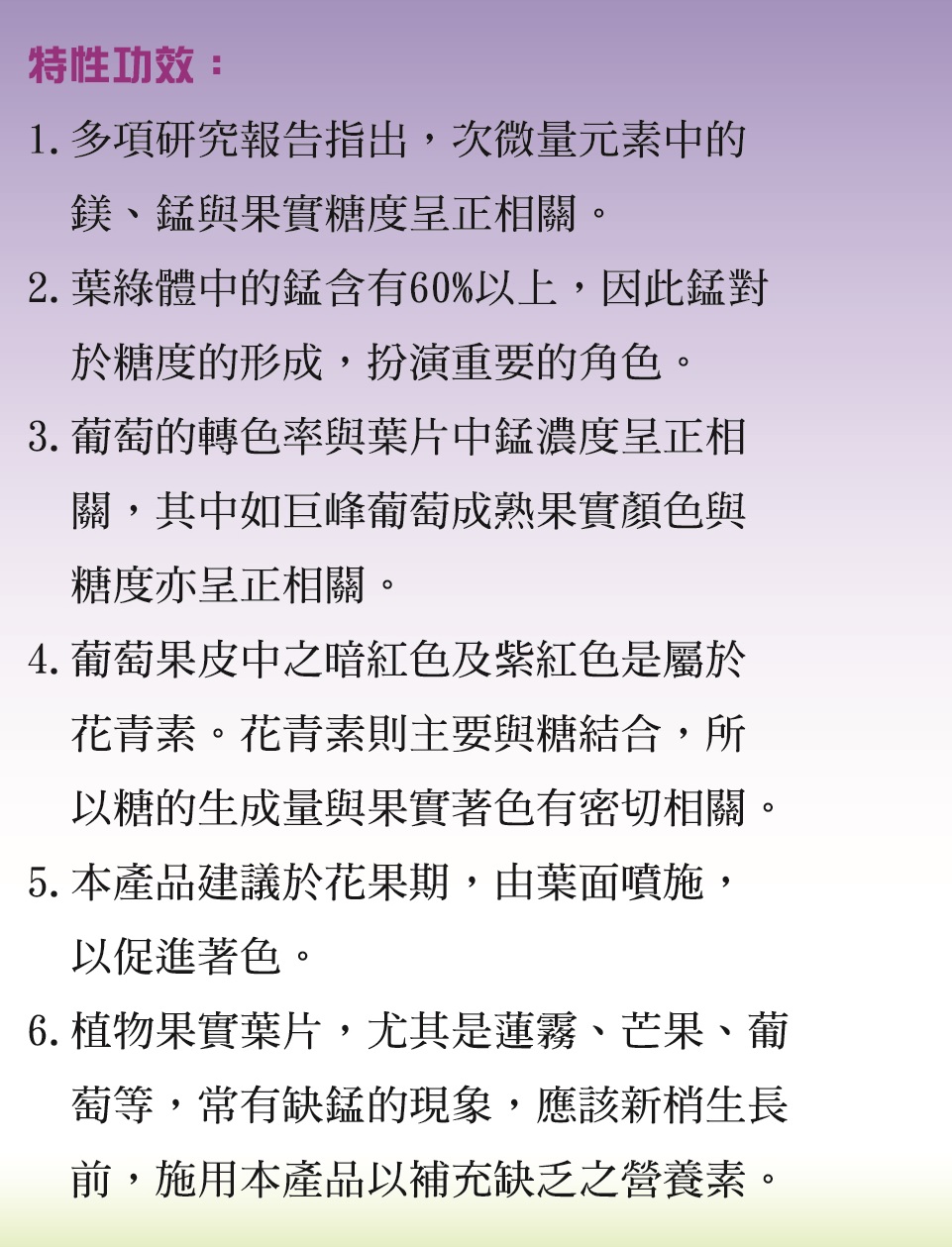 ►多項研究報告指出,次微量元素中的鎂、錳與果實榶度呈正相關。
